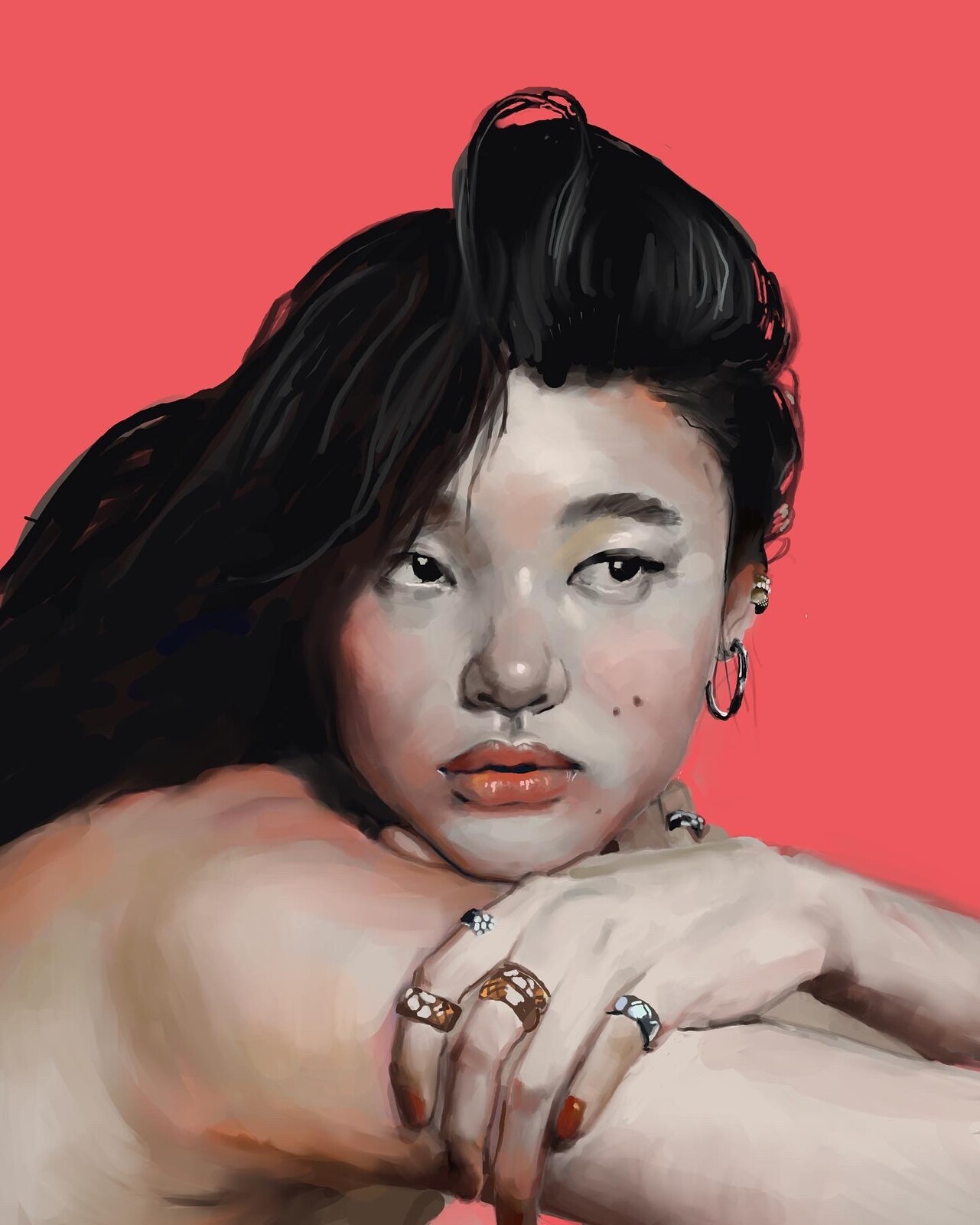 This painting is about texture and mood. I wanted to capture the buttery softness of fingers and the way rings sit on skin—cool, smooth, and a little heavy. Her expression says a lot without trying: nonchalant, maybe fed up, and a little tired. There’s a hint of hopelessness in her eyes.